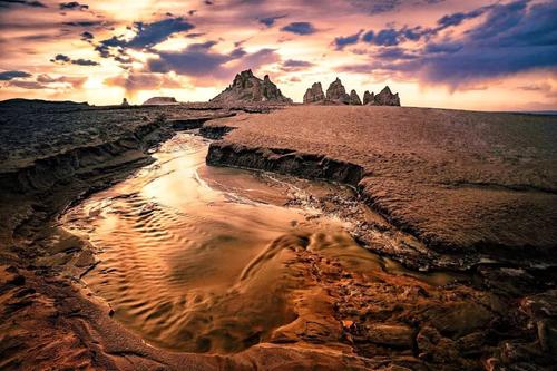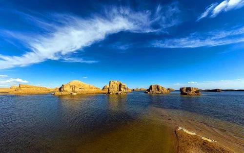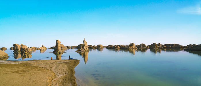 隨后我們來到深居柴達木盆地腹地的【水上雅丹】。這是世界上唯一一處水上雅丹地貌,因其位置較偏僻,即使是當?shù)厝艘部赡懿恢趺催^去,所以至今仍是一片未開發(fā)的處女地,鮮少有人涉足。這立于汪洋之上的雅丹地貌群經(jīng)過上千年的風雨殘蝕,如同遨游大海顯露脊背的群鯨,湖岸邊高大的鯨背是天然的觀景臺,極目遠望,西邊是高低錯落的水上雅丹地貌群,有的如策馬揚鞭,有的如奔馳的駱駝,有的像婀娜多姿的女子,魔幻而神秘。以清澈透明的藍天為幕,參差錯落的雅丹地貌與碧波交相輝映,天上鴨鳴雁啼,水中波光粼粼,這一望無際的荒漠中憑空而出了一片”汪洋“,只有親身看過這一片汪洋上的鬼斧神工之作,才會明白為它為什么會被人稱為“魔鬼城”。