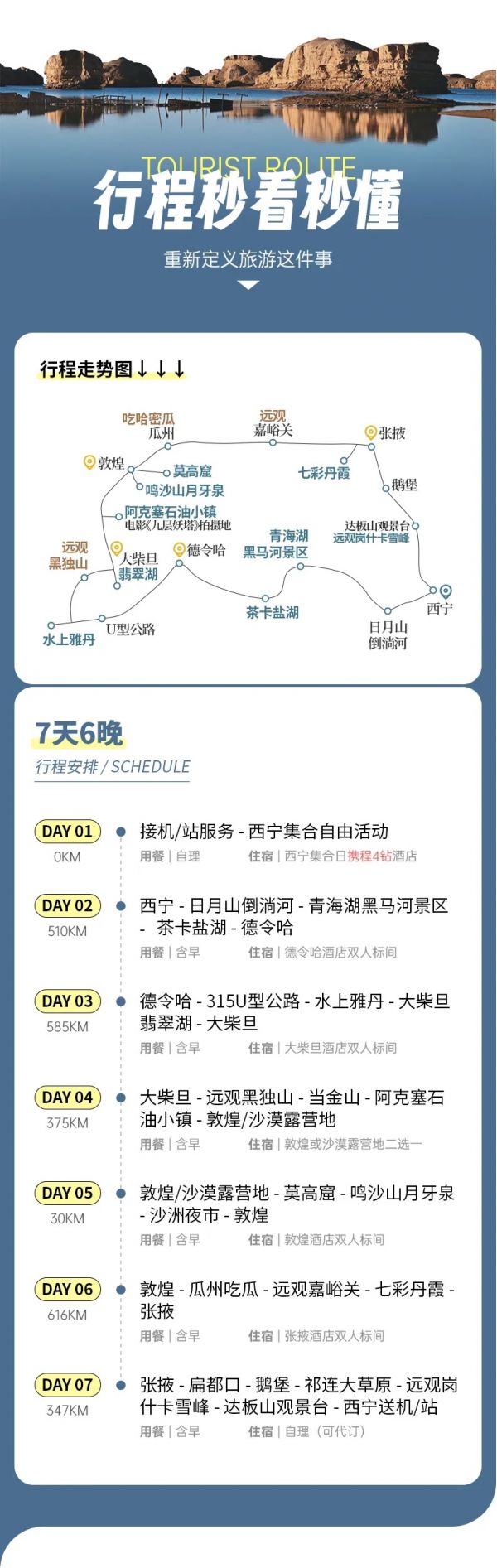住宿:行程所列住宿地6晚住宿,每人1床位(含西寧集合日4鉆酒店1晚、不住不退不換不指定)具體了解團期價格。