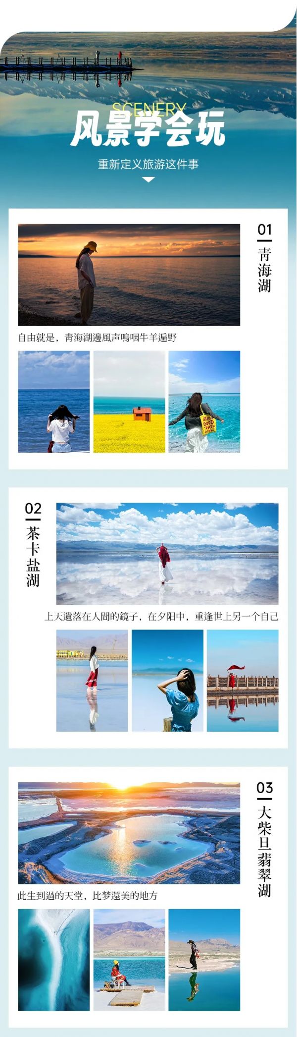 告別水上雅丹前往大柴旦翡翠湖,一路仍是廣袤戈壁與連綿山巒。臨近翡翠湖,空氣都透著清新。翡翠湖由眾多鹽湖組成,碧綠湖水在陽光照耀下,像散落人間的翡翠般閃耀。湖水顏色隨天氣、光線變化,時而祖母綠,時而薄荷綠,時而淡藍,如夢似幻。湖邊鹽灘潔白,與碧綠湖水形成鮮明對比。漫步湖邊,腳下鹽灘柔軟,眼前美景如畫,身心都得到放松。在這里,既能賞湖景,又能了解鹽湖形成與鹽業發展,感受自然神奇與人類智慧。