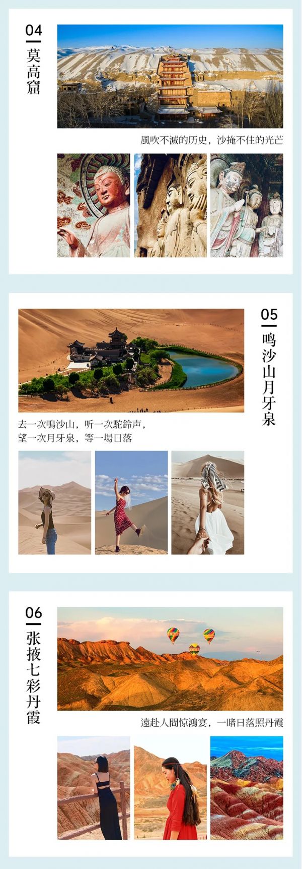 5.關于莫高窟門票的說明:正常門票238元/人,每天限6000張,可游覽八個洞窟。應急票148元/人,每天限12000人,可游覽四個窟。旅游旺季一票難求,請報團后及時到“莫高窟預約網”公眾號自行購買門票。(提前一個月內均可購買,具體方法可私信客服)