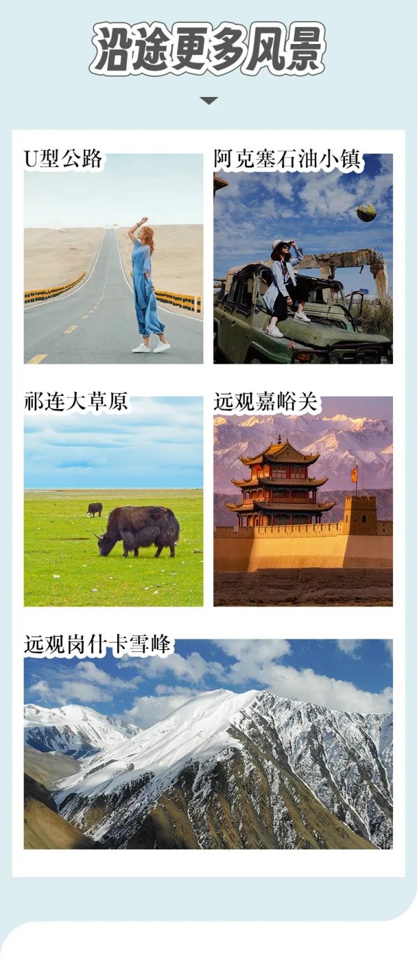 今日行車時間較長,建議游客自備一些零食在路上用,途中可欣賞到西北的戈壁美景和祁連山上終年不化的積雪。