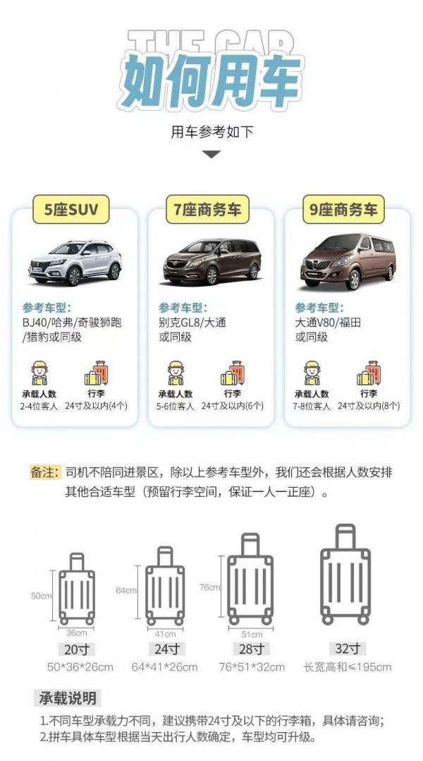 為保證成團及質量,根據人數派不同座位數用車,保證每人一正座;