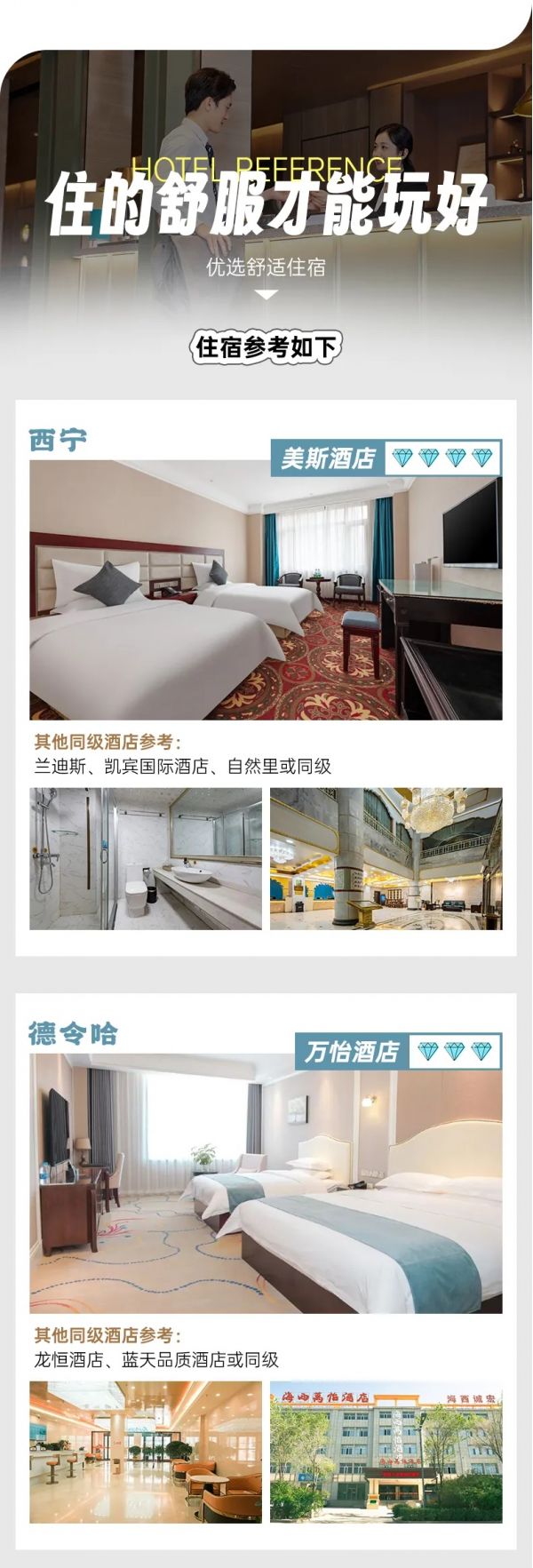 3.到達西寧后自行前往指定酒店入住,辦理入住時需要交押金,房費已付,押金自理,報姓名拿房卡。