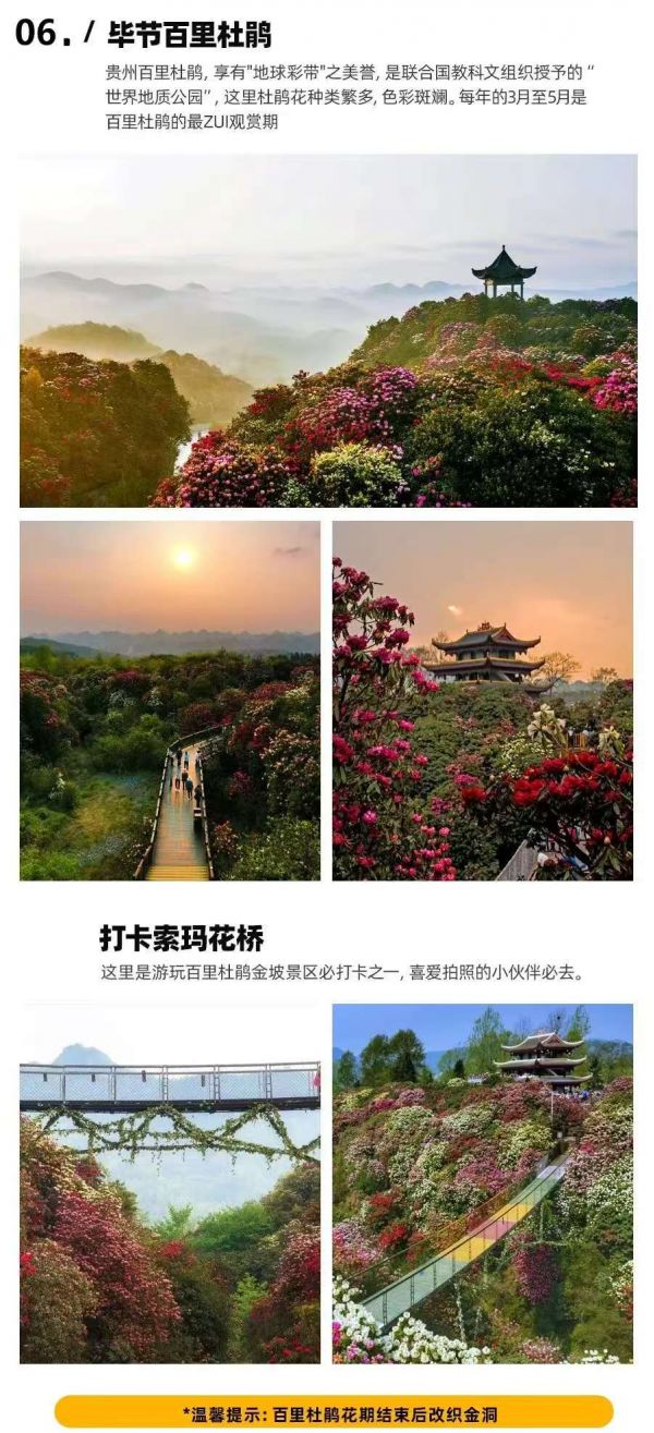 1、每年3-4月行程安排為百里杜鵑景區,花期過后百里杜鵑景區替換成織金洞景區,不同時安排游覽兩個景點。