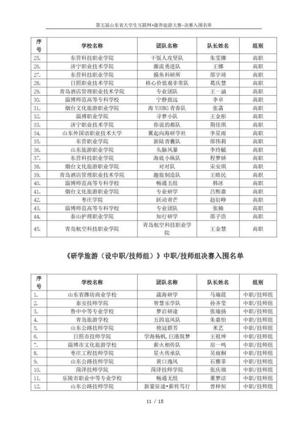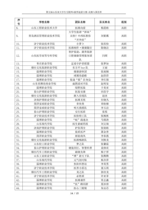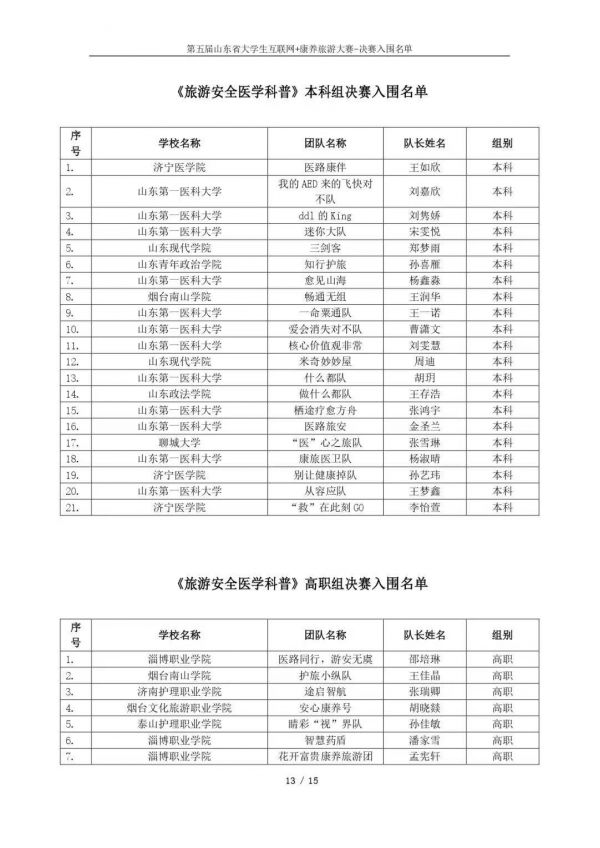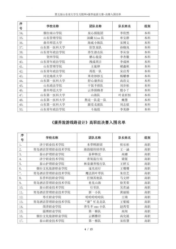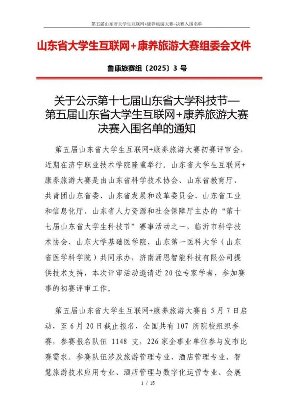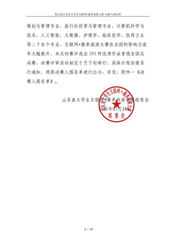 以下鏈接為第五屆山東省大學生互聯網+康養旅游大賽決賽入圍名單公示通知原文件:https://mp.weixin.qq.com/s/bd61lqBY3XZJo0ujX1mO_g?scene=1&click_id=2