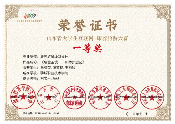 11月13日,第十七屆山東省大學(xué)生科技節(jié)——山東省大學(xué)生互聯(lián)網(wǎng)+康養(yǎng)旅游大賽獲獎(jiǎng)名單公示,在劉寶平、岳碩兩位老師的指導(dǎo)下,聊城職業(yè)技術(shù)學(xué)院劉寶平師生工作室成員馬譽(yù)熒、張芮暢、李雨欣憑借“康養(yǎng)旅游線路設(shè)計(jì)”作品脫穎而出,成功摘得賽事一等獎(jiǎng)。
