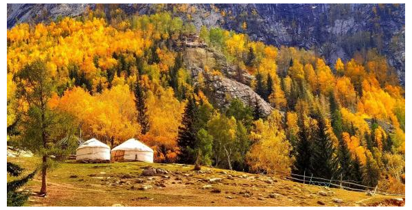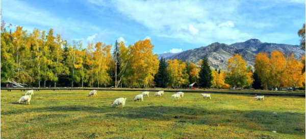 隨后的時光造訪了塔拉特民俗村。這座藏在阿爾泰山間的哈薩克族村落正被豐收的喜悅包裹,居民的院子里晾曬有金黃的玉米,屋檐下掛著一串串紅辣椒,牛羊在村外的草地上悠閑啃食,遠處傳來幾聲牧人的吆喝,充滿了生活氣息。走進一戶村民家,主人熱情地端上醇厚香甜的奶茶與外酥里嫩的馕餅。陽光透過氈房的格窗灑進來,在地上投下斑駁的光影。坐在鋪著絨毯的炕上聽戶主講述生活點滴,忽然覺得所謂歲月靜好,大抵就是這煙火尋常吧。