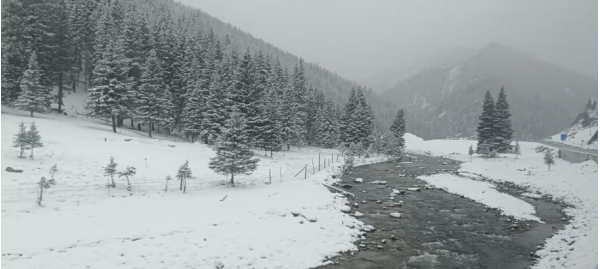 午后依依不舍地離開可可托海鎮,沿331國道向阿勒泰進發,神奇的北疆又給了我們意外的驚喜——漫天飛雪悄然降臨。細密的雪花紛紛揚揚落下,給路旁的樹木披上了一層薄紗,金黃的葉片與潔白的雪花相映,構成了“一半金秋,一半冬雪”的奇景。車輪碾過薄薄的積雪,發出“咯吱”的輕響,車窗外風景不斷變換,時而穿過雪霧彌漫的山林,時而望見開闊的雪原,每一處都像闖入了童話世界。這場不期而遇的雪,讓旅途多了幾分詩意與浪漫,也讓我們更深刻地體會到北疆“一日四季”的神奇。為了確保安全,我們在8866公里標志牌拍照留念后,又掉頭改道走高速奔赴阿勒泰。