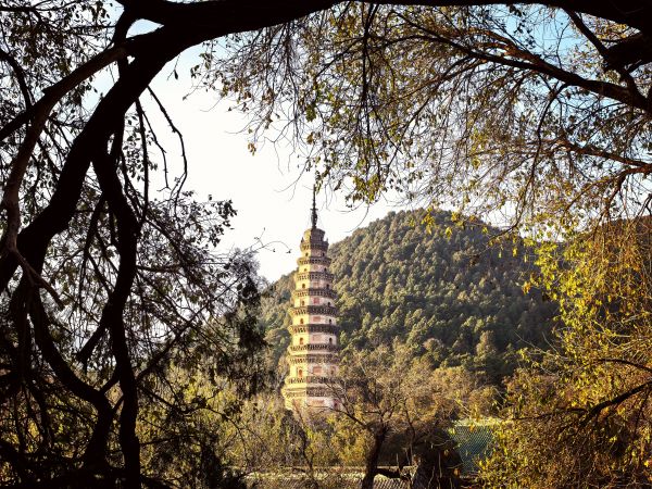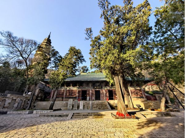 穿過(guò)千佛殿,辟支塔的身影在蒼松翠柏間傲然挺立。這座11層的樓閣式磚塔高約54米,塔身雕飾精美,每層都有錯(cuò)落有致的門(mén)窗和欄桿,塔頂?shù)南噍唽毶w在陽(yáng)光下熠熠生輝。