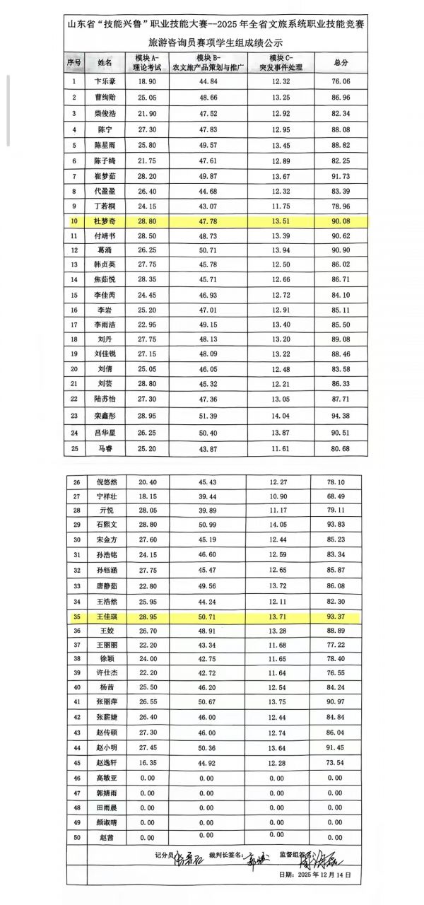 12月14日,2025年山東省“技能興魯”職業(yè)技能大賽全省文旅系統(tǒng)旅行社咨詢員賽項圓滿落幕,聊城職業(yè)技術學院學生表現(xiàn)亮眼,在劉寶平老師和李雁老師的辛勤指導與精準賦能下,王佳琪斬獲一等獎,杜夢奇榮獲二等獎。