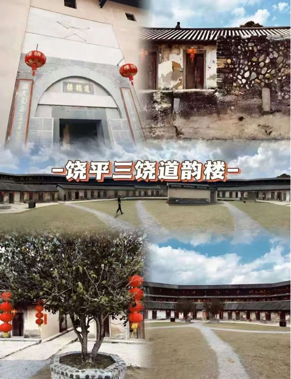 抵達后前往參觀【道韻土樓】(必消套餐含門票)中國最大的客家土樓 ,樓體為最奇特的八卦造 型 。 八卦宇宙圖式布局 :樓埕為太極 ,埕左右兩公用 水井象征 “ 兩儀 " (俗稱 “ 陰陽魚 ”) , 八面三進圍屋像爻畫,埕和屋內 的明溝暗涵寓 陰陽之合 。道韻樓居 民的祖輩 請勘 輿師擇地建樓 ,勘 輿 師先到此地勘察 ,初 覺此地地理位置佳, 出于慎重考慮 , 又轉 了幾 十里路 ,察看幾個地方 ,還 是覺得倒不如這個地方 好 , 又倒 回來 , 潮州 話叫做 “ 倒運 ” 。 后來起名字時 , 借 “ 倒運 ” 的諧音 , 就叫 “ 道 韻樓”。