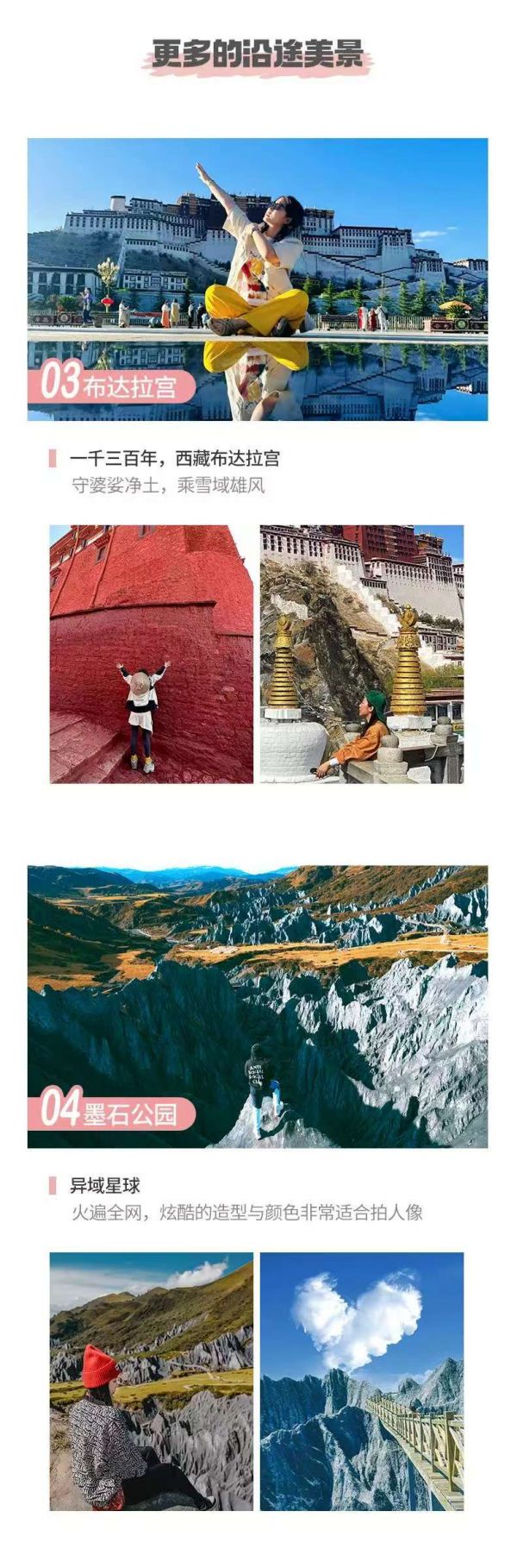 包含四姑娘山雙橋溝門票、理塘套票、甲居藏寨門票、米堆冰川門票、雅魯藏布大峽谷門票、墨石公園門票、嘎拉桃花村門票、布達拉宮門票(如持有優惠證件者,請在報名的時候告知,我們會在行程結束后退還相應差價)