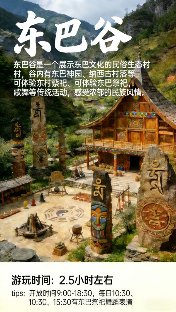 東巴谷則是一個充滿神秘色彩的地方,谷內有許多東巴文化的雕塑和建筑,