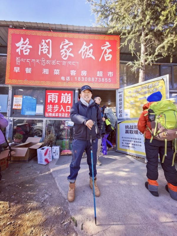 走到笑農大本營,大家靠著木欄桿歇腳,看著遠處的雪山,劉會長說:“當年的伐木場,如今成了徒步者的驛站,時光真是奇妙。”