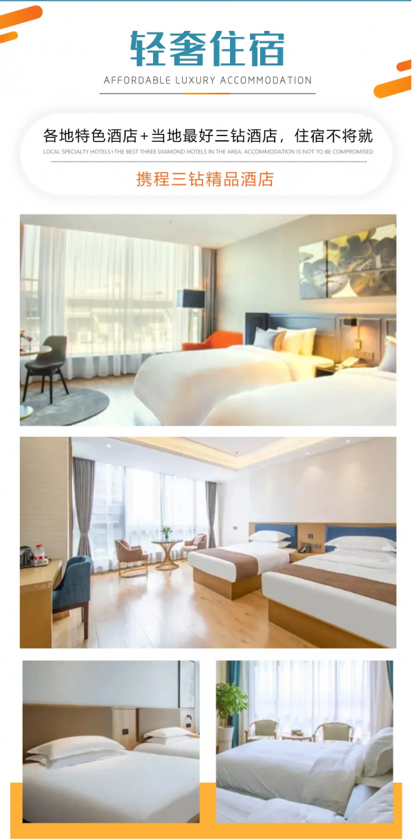 行程中的所列的酒店類型,2星/2鉆=經濟型;3星/3鉆=舒適型;4星/4鉆=高檔型;5星/5鉆=豪華型;意為評定或條件到達相應標準的酒店,少部分地區,由于政策等因素,可能存在酒店條件滿足,但未進行星鉆評定的情況。