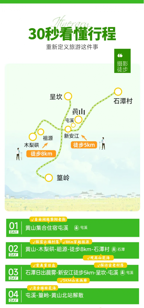行程結束當天預計15:30點抵達黃山北站解散,前往黃山屯溪機場可打車(用時約25分鐘),火車/高鐵建議購買16:30以后的車次!飛機建議買16:30以后的航班。
