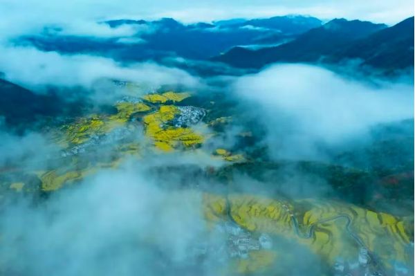 江嶺的春,是大自然揮毫的壯闊史詩(shī),以萬(wàn)畝梯田為卷,以金黃花海為墨,鋪展出讓人屏息的磅礴。