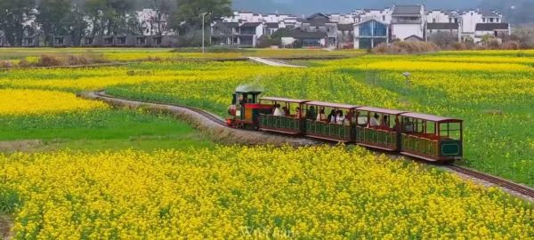 嚴(yán)田的七彩油菜花海鋪展成夢(mèng)幻畫卷,黛瓦白墻的徽派古宅隱于繽紛花浪間。乘春日小火車緩緩穿行,鳴笛聲輕漾花海,清甜花香漫入車窗,一路盡賞花海與古村相融的靈動(dòng)景致。