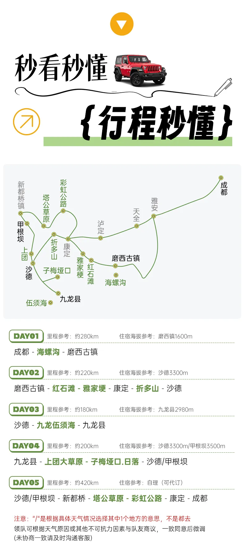 景點海拔參考:紅石灘(2500m-3800m)、雅家埂(3830m)、折多山(4298m)