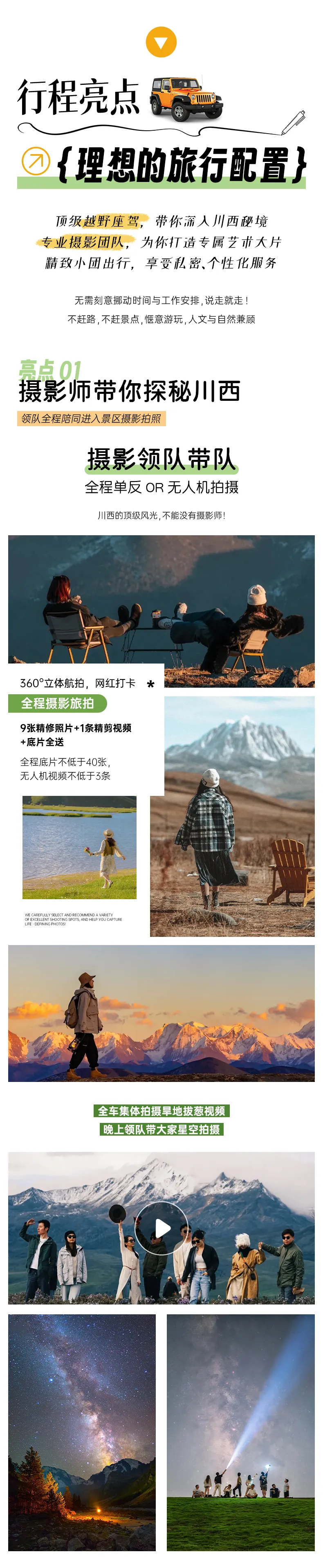 無人機+單反旅拍(底片全送+9張精修照片+1條精剪視頻),底片全程不低于40張,無人機視頻不低于3條(全車人拍攝旱地拔蔥視頻,晚上領(lǐng)隊帶大家星空拍攝);