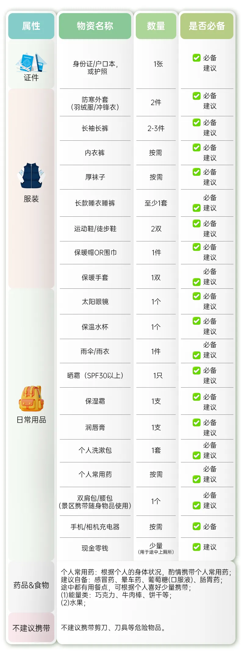 (5)長途:景點分散,距離較長。故乘車時間長易疲勞,帶一些零食、飲用水、撲克牌等,途中消遣;