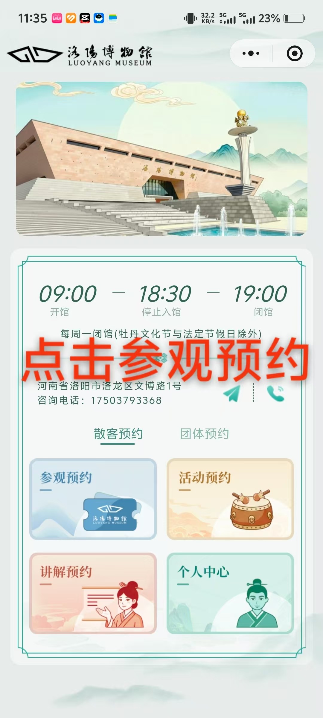 咨詢電話:每周二至周日和法定節(jié)假日(開放期間)撥打17503793368,每周一撥打0379-69901002。