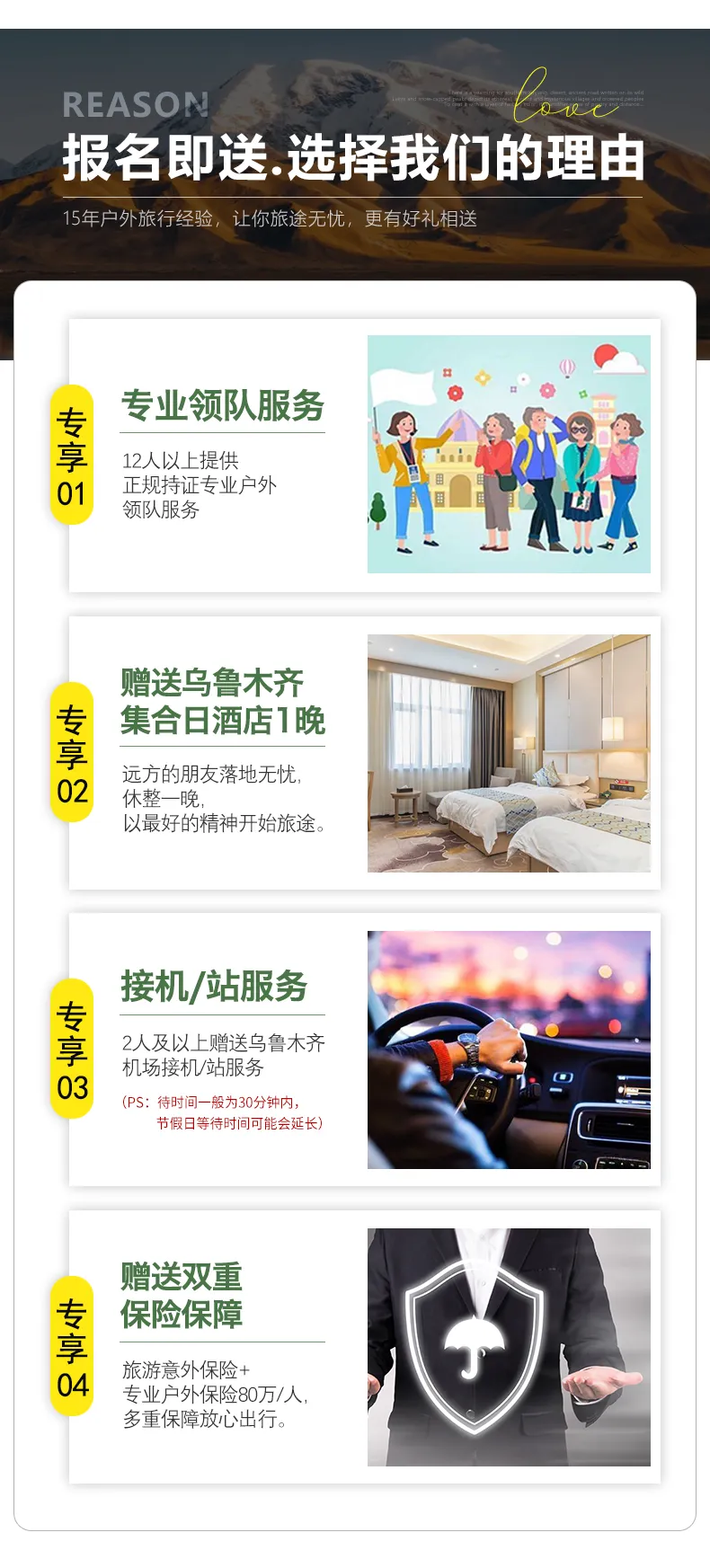 接機站服務:本次活動提供烏魯木齊市內24小時接機/接站服務,工作人員會在您出發日期前一天21:30之前向您推送消息并與您聯系,如果超過時間沒有接到任何通知,請及時與報名處聯系。(接站等待時間一般為15-20分鐘,最長不超30分鐘,節假日拼單人數較多情況下客人等待時間可能會延長)。
