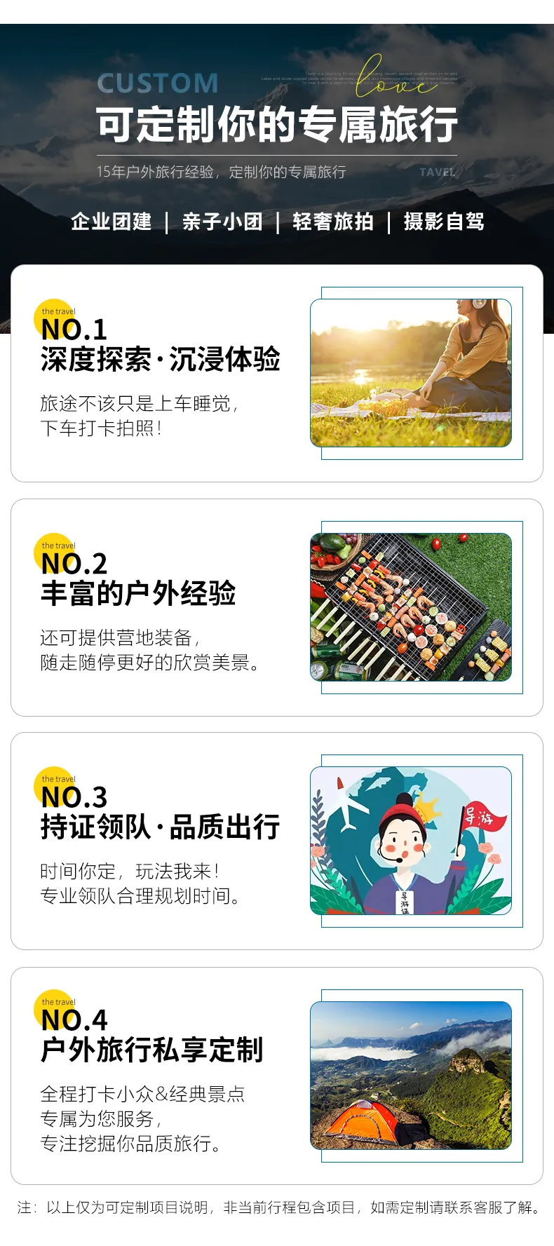 私人訂制:我們業務范圍囊括了全國各大城市,川西、西北、新疆、西藏,在路上永遠有我們的身影。我們將為每一個有定制需求的你策劃出獨屬于自己的完美旅行。