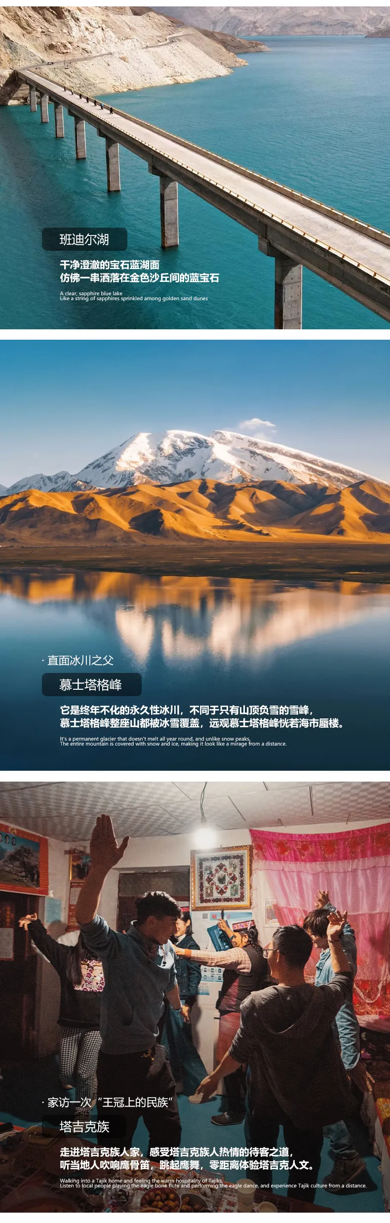 告別“東方摩洛哥”—喀什,我們將開啟一段帕米爾高原之旅。沿314國道一路暢游帕米爾高原風光,首先驚艷我們的是背靠白色沙丘和雪山的【白沙湖】,在陽光的變化下,湖水時而呈湛藍色,時而呈綠色。更令人驚嘆的是,藍色的湖面與白沙相接,一半藍一半白,而白沙背后還有雪山。在雪山和白沙的映襯之下,白沙湖水更顯澄澈。在這里能get湖泊、白沙、雪山同框的畫面。分享一個冷知識:白沙湖又名流沙河,就是西游記里唐僧收服沙和尚的地方。我們還能途觀慕士塔格峰,山頂常年皚皚白雪,猶如滿頭白發,十余條冰川鑲嵌在峰體下的峽谷中,如胸前飄動的銀須,故有“冰山之父”的美稱。隨后我們將遇見【卡拉庫里湖】,這里能看到雪山倒映在湖面的風景,拍出來的照片特別的給人純凈的感覺。