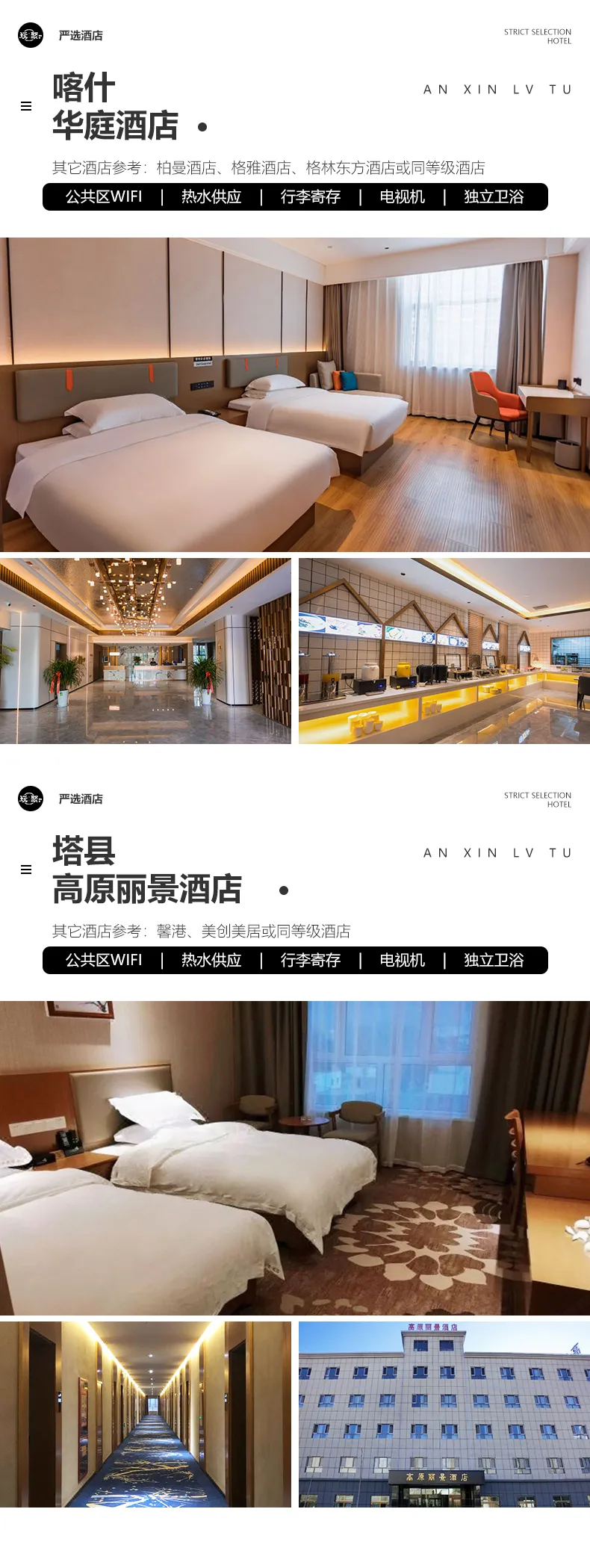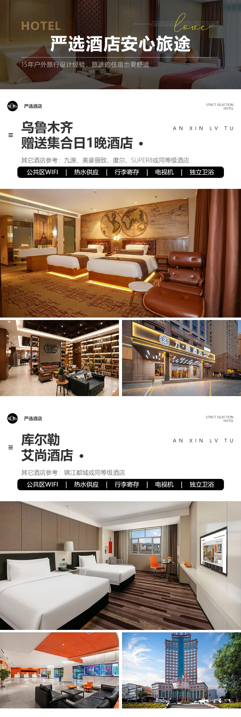 住宿:行程所列7晚住宿。我們會提供行程內展示照片的酒店或其他條件相似酒店,但因沿途條件有限,如酒店設施達不到您的期望,請您諒解。參考酒店如下: