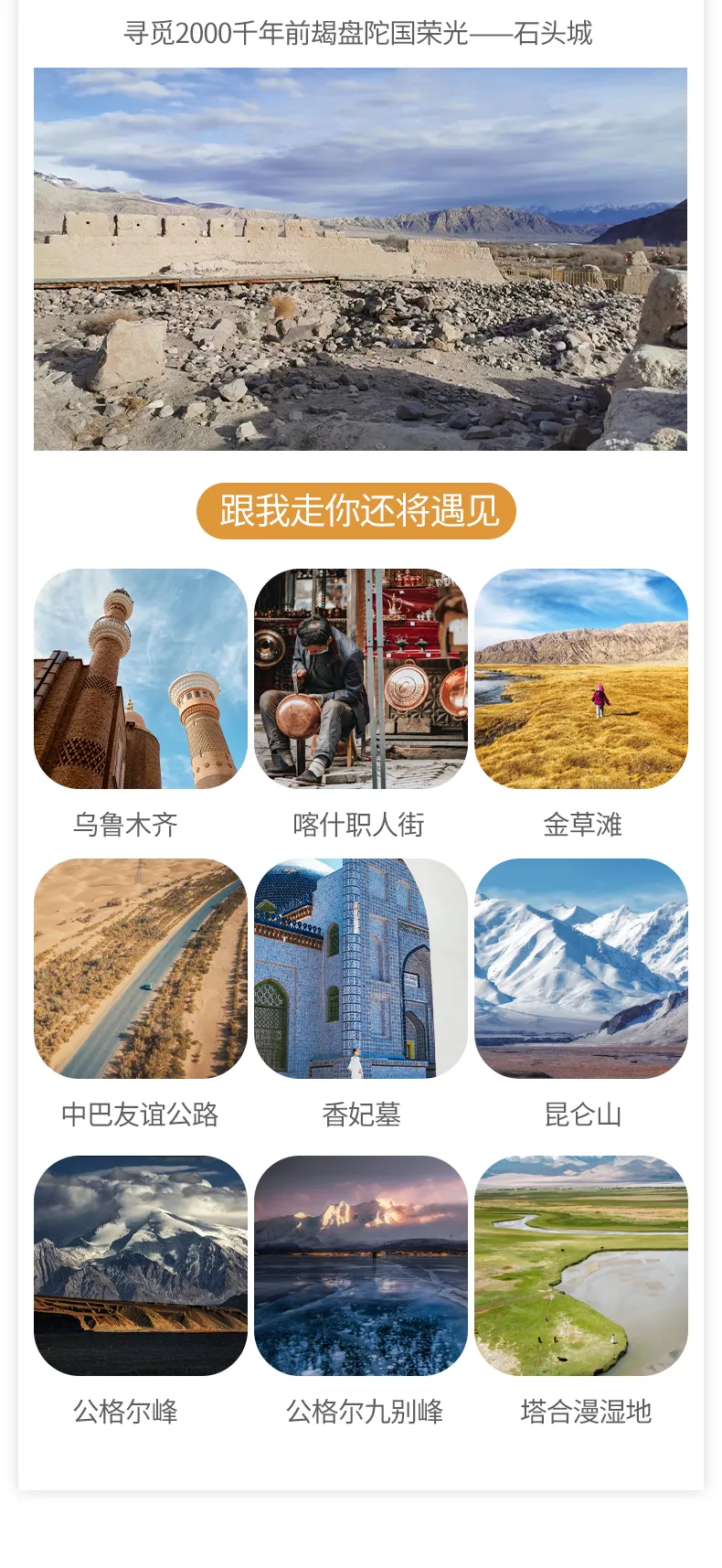 今天我們將去到中國最西部的城市—【喀什】,用整整一天的時間去領略這個“你未曾前往,但始終向往”的城市魅力。來喀什必須要逛逛【喀什古城】,喀什老城每天有兩個開城儀式表演,時間分別是:早晨10:30 下午18:00,向來自五湖四海的朋友們展示自己熱情的好客之道。之后我們進入古城漫步在古城的街道,老城區街巷縱橫交錯,布局靈活多變,曲徑通幽,民居大多為土木、磚木結構,不少傳統民居已有上百年的歷史,是中國以伊斯蘭文化為特色的迷宮式城市街區。這里巷道狹窄彎曲,奇特的過街樓、小胡同、手工作坊隨處可見,生土建筑比比皆是,被中外游客譽為“維吾爾族活的民俗博物館”,是喀什這座中國歷史文化名城的內涵所在。