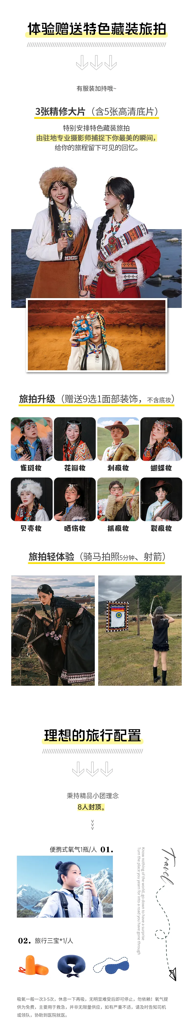 1、包含體驗特色藏裝旅拍(3張精修照片含5張高清底片),面部裝飾9選1,不含底妝;