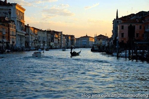 黃昏時分,夕陽在水道邊的房子撒下一角,這時,坐著岡朵拉,聽著船夫的歌聲,泛舟河上。遠眺光影浮運的建筑,體會威尼斯的旅情。