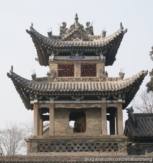 站在過樓下,向兩邊可以望到南北夾樓和鐘鼓二樓。夾樓是當年演員唱戲時化妝休息的場所,樓下各有門以便于人們通行,門楣上刻有“望海”“對岳”,是以此表達商人們高瞻遠矚,站在這兒可以看到泰山和東海。鐘鼓樓均為筑于磚石方臺上的二重檐歇山十字脊方形樓閣。