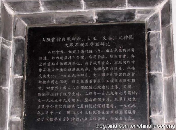 春秋閣位于會館的最后一邊院落,高兩層,嘉慶十四年完工的春秋閣是會館最高大的建筑。春秋閣的額坊均為木質透雕,內容主要為三國人物、民間故事、牡丹龍風、瓜果等圖案。造型逼真生動,栩栩如生。閣下原供有木雕神像,閣上有關公挑燈讀春秋的神像和其生平連環(huán)畫,但均毀于戰(zhàn)亂。只有閣上墻壁還鑲有一幅關羽坐式線雕像,線條流暢精美。春秋閣的興建正是為紀念關公挑燈讀春秋這一典故而建的。會館的大小石碑共有十八塊,完整地紀錄了從買地,興建到歷次重建所花費的每一筆銀兩開支數(shù)目及捐銀兩的商號的名稱及捐銀數(shù)字,對于研究會館歷史來源是非常重要的。