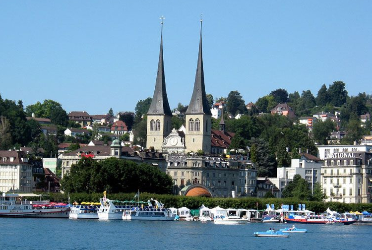 有兩座美麗尖塔的豪夫教堂(Hofkirche),位于盧塞恩湖的北面,是盧塞恩最重要的教堂。公元735年開始建造,是羅馬式建筑,到14世紀改建為哥特式,17世紀的一場大火中受到了嚴重破壞,隨后又改建為文藝復興式。教堂內部莊嚴肅穆,禮拜席上有生動細膩的雕刻圖案。教堂的管風琴,1640年制造,共有4950根風琴管,至今仍在盧塞恩的夏季音樂節上使用。