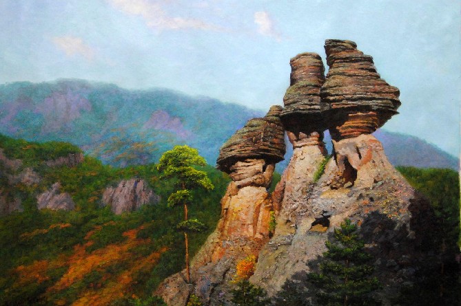 它是約100萬年前(即新生代第3期),從長白山( 朝鮮人稱:白頭山) 的火山脈噴出的熔巖冷卻后凝固而成的流紋巖、玄武巖等火成巖,經受了長時期的風蝕雨削,形成一座座的山峰,形狀奇異。面積約為250平方公里。