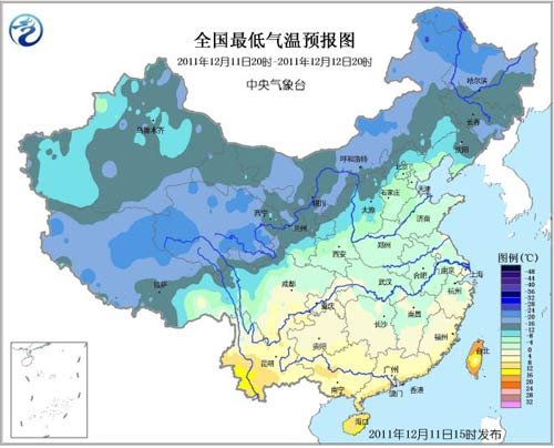12月11日20時至12日20時全國最低氣溫預報圖