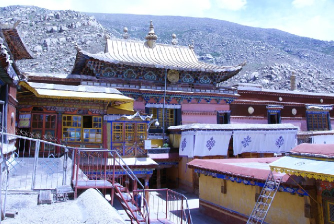 從拉薩市中心坐4路公交、出租車或者三輪車只能到山腳,然后要徒步30分鐘上山。寺廟每周三都有法事活動,眾喇嘛齊聚一堂念經,場面壯觀。