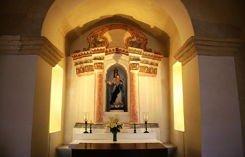 圣母雪地殿教堂的天花呈拱形,墻身繪有圣經(jīng)故事和人物的彩色壁畫。祭衣房的壁畫線條秀麗活潑,揉合了中國的繪畫技法和西方色彩,中西方的文化與藝術(shù)和諧地融匯一起。壁畫繪有:瑪利亞、圣安東尼、獅子、雙頭鷹與牡丹等圖案,極具藝術(shù)價值與觀賞性。