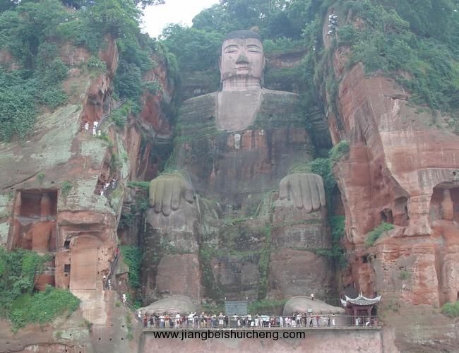 樂山大佛頭與山齊,足踏大江,雙手撫膝,大佛體態勻稱,神勢肅穆,依山鑿成,臨江危坐。大佛通高71米,頭高14.7米,頭寬10米,發髻1051個,耳長6.7米,鼻和眉長5.6米,,嘴巴和眼長3.3米,頸高3米,肩寬24米,手指長8.3米,從膝蓋到腳背28米,腳背寬9米,腳面可圍坐百人以上。版權所有,山東聊城聊之旅國際旅行社有限公司,轉載必究!在大佛左右兩側沿江崖壁上,還有兩尊身高超過16米的護法天王石刻,與大佛一起形成了一佛二天王的格局。與天王共存的還有數百龕上千尊石刻造像,宛然匯集成龐大的佛教石刻藝術群。大佛左側,沿“洞天”下去就是近代開鑿的凌云棧道的始端,全長近500米。右側是唐代開鑿大佛時留下的施工和禮佛通道——九曲棧道。佛像雕刻成之后,曾建有七層樓閣覆蓋(一說九層或十三層),時稱“大佛閣”、“大像閣”;宋時稱“凌云閣”、“天寧閣”;元代稱“寶鴻閣”;明代俗稱“佛棚”、清代俗稱“佛亭”,最終廢毀……至今,仍舊可以從大佛兩側的山崖上看到多處孔穴和屋檐痕跡,專家證實,這些正是歷代建造或維修樓閣時,安置梁柱和屋檐的地方。