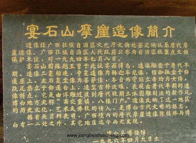 宴石寺正門上書有“宴石寺”三字。它的門聯和重門聯為:“宴會群仙地,石開一洞開”、“宴石鐘靈千古秀,仙橋毓秀萬年居”聯首分別嵌上“宴石”和“宴石仙橋”顯然把宴石寺、宴石山、宴石仙橋三景融為一體。宴石山壁立如削,寺頂平坦,密草叢叢,荊蘿盤生,輕紗般的霧靄在林間回蕩飄逸。版權所有山東聊城聊之旅國際旅行社有限公司,轉載必究!往昔,山頂正中有一泓清泉,波光如鏡,池中五彩斑斕的菩薩魚與藍天白云相映,恍如神魚遨游蒼穹;山頂清泉從峭壁上飛瀉而下,擊中陡崖的凸處,濺起霧珠,被陽光染成七色彩珠,仿佛為宴石寺石山披上一輪佛光,讓人更添神往。站在宴石山頂向東望去約10公里有雞婆石,它象一個正孵蛋的母雞蹲在雞窩中,在它的背脊上有一個歪著腦袋窺天的“雛雞”,筆者曾爬上過此山,僅用一個手指就算有百十人共同出力,也休想挪開它半寸。向南看,蜿蜒的南流江下游約3公里,在兩處山峽間有一個大平湖,這就是東漢伏波將軍馬援當年為平交趾叛亂,動用十萬兵士疏鑿出來的馬門灘。向西看去,巍峨雄偉的云飛樟矗立天極,它的身后就是峰巒疊嶂的六萬大山。向北觀看,遠處是煙靄籠罩的博白城;中間有一座昂天嘯吼的獅子石山,它口中冉冉騰起熱浪直沖云霄;近處又是丹霞地貌最典型的紫陽冠了,它像一定圓形的禮帽,扣在地表上。在宴石山頂,山風習習,颯氣沐身,環顧四周,頓覺宴石山成了宇宙的中心,整個乾坤都渺小了。再有江東岸寺西石壁上鐫有神像三尊。摩崖造像雕鑿在離河面約15米的紅砂巖石崖壁上,高三米。中龕坐佛一尊,左右龕為一佛二菩薩。佛像頭部長方形,兩耳垂肩,身披袈裟,袒右肩,結跏跌坐于束腰式須彌高蓮座上。左右兩龕佛座各辟一小龕,內雕獸頭。造像無題記,從雕刻風格及其造型、面像、服飾分析,應是隋唐或水稍前刻成,自治區旅游局認定是“廣西第一摩崖”,是目前廣西境內已知年代最早的摩崖造像之一。摩崖造像地處漢、唐中原交趾(今越南)交通要道南流江畔,為研究我國佛教的發展和南傳提供了可貴的資料。清道光十二年縣志載,摩崖旁“有臨江巨佛一座,高五十余丈,未窮何年所鑿”。遺憾的是,此巨佛在清末或民國初已倒塌跌落江中,現僅留佛座底裙,尚依稀可辨。
