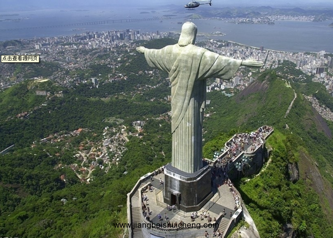 登上科爾科瓦多山,眼前又是另一番的景致。在海拔七百余米高的峰項(xiàng)建有一尊巨大的耶穌塑像,高三十八米,重一千二百余噸,是世界巨型雕塑之一。耶穌像身軀直立,兩臂平展,仿佛是一個(gè)巨大的十字架立在山頂,它寓意著巴西是一個(gè)天主教國(guó)家。