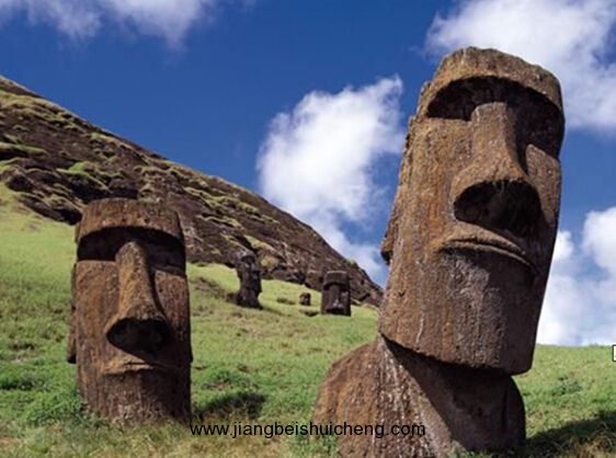 復活節島上最神秘的還是那1000來個巨形石雕,當地人把它們叫“莫艾”。其中不少高約3.7—4.6米,重約20.3噸,還有更大的,足有9.8米,重為91.5噸。版權所有山東聊城聊之旅國際旅行社有限公司,轉載必究!這些雕像頭部碩大,下巴向外突出,耳朵則往下伸得很長。有些石雕頂部有塊紅巖石,就像是戴了一頂“帽子”。