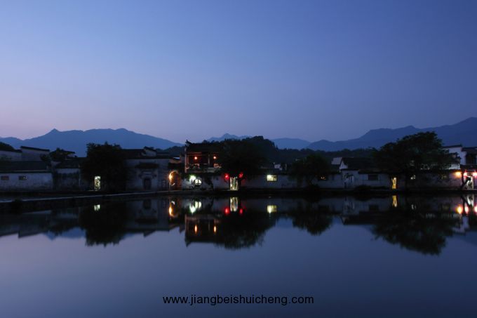 斜日余暉之中,游人的足步聲在小巷里漸漸消散。宏村中央半月形的池塘,水平如鏡,波光鑠金,蕩漾著四周古民居的倒影:粉墻、黛瓦、馬頭墻、藍天白云.....,在池塘邊,婦女在浣洗,兒童在戲耍,偶而有人從旁走過,向池塘撒下一片笑聲。