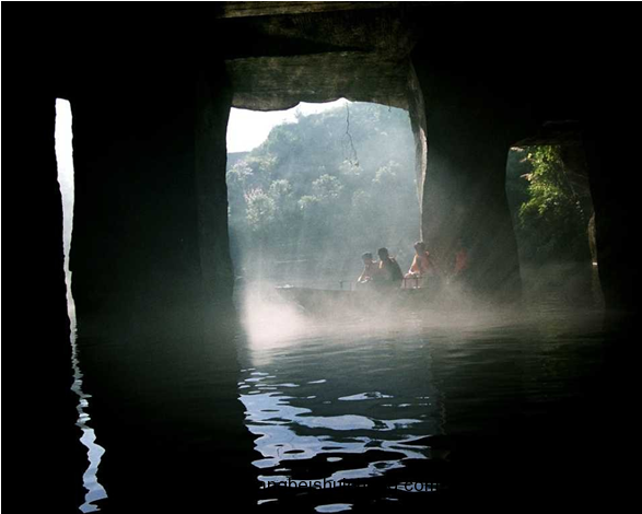 地下長廊(2號洞)此洞在半山腰,洞口呈虎口張開之勢。入洞后隨坡下延,涼氣浸淫,花山謎窟,回望洞口,早已霧氣騰騰。版權所有,山東聊城聊之旅國際旅行社有限公司,轉載必究!洞內有幾十根石柱昂然挺立,組成長80米,寬1.5米、高4米的地下長廊。右側這處有一方形洞口,入內方知廊中有廊。其走向相同,但深度更深,足有百米,水呈翡翠綠色。在2號窟里,一幅天然的秋色圖再次讓人贊嘆不已。只見整個畫面均被褐黃色的秋葉渲染:黑色的叢林、山峰、古民居點綴于秋葉叢中,那古民居還能明顯地看出徽派的建筑風格。近處,一條白色的小河從古民居前穿過,這無疑就是位于石窟外山腳下的新安江了。