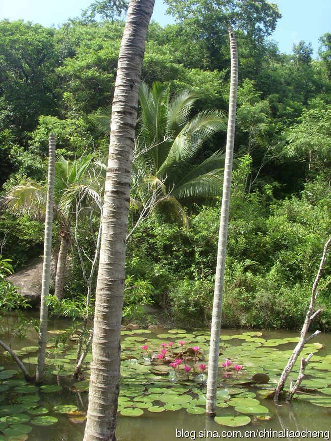 蔥翠的熱帶樹木栽種在各處,高高的直插云霄。水中荷葉漂浮,荷花朵朵,好美的一幅水彩畫啊!