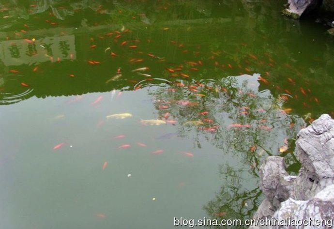 水中綠色倒映,五顏六色的魚自由自在地游來游去,顯得真是活潑可愛啊。