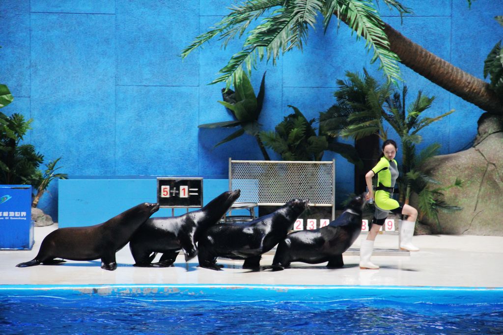 在海洋劇場里有幽默滑稽的海獅表演和浪漫刺激的海豚表演,上演八頭海豚同臺演出、浪漫騎士、激情沖浪、呼啦圈大賽、尾鰭拍球送大禮、高空頂球、人豚共舞、海獅搶凳子、海獅算數、海獅排球賽、海獅音樂會、海獅空中360°翻轉等令游客歡欣雀躍的精彩表演。