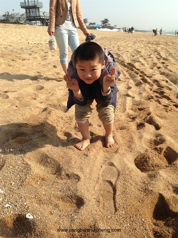 你看那個小男孩兒,被海浪打上來了吧,還是老實點(diǎn)兒玩沙子吧